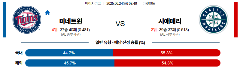 미네소타 대 시애틀 MLB 06월24일 맞대결 생중계, 스포츠중계, 스포츠분석