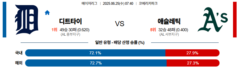 디트로이트 대 애슬레틱스 MLB 06월25일 맞대결 생중계, 스포츠중계, 스포츠분석