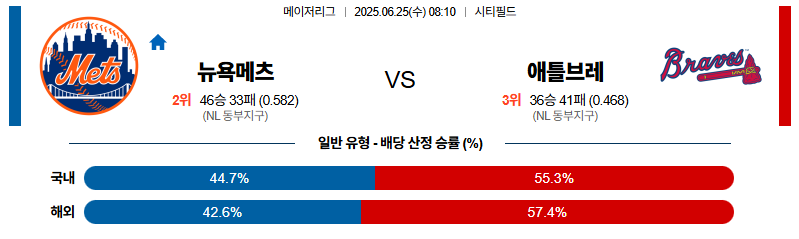 뉴욕메츠 대 애틀랜타 MLB 06월25일 맞대결 생중계, 스포츠중계, 스포츠분석