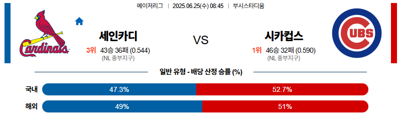 세인트루이스 대 시카고컵스 MLB 06월25일 맞대결 생중계, 스포츠중계, 스포츠분석