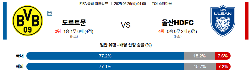 도르트문트 승, 핸디 승, 오버. 울산은 수비 대형 유지에는 집중하지만 공격 흐름에서 위협적인 장면을 만들어내기 어렵습니다. 도르트문트는 스리백 중심의 압박 전개와 전방 결정력을 바탕으로 상대를 제압할 전술적 완성도를 갖춘 팀입니다. 이번 경기는 도르트문트의 승리 흐름 쪽으로 명확히 기울 가능성이 높습니다.