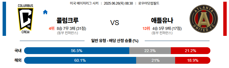 콜럼버스 대 애틀랜타 메이저리그사커 06월26일 맞대결 생중계, 스포츠중계, 스포츠분석