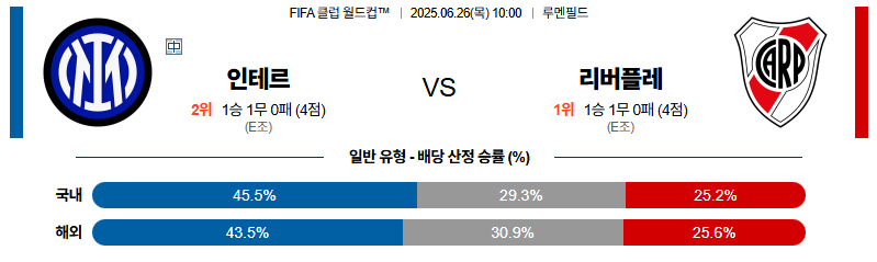 인터밀란은 수비 조직과 압박 응용 능력을 기반으로 경기 전체를 통제할 수 있는 팀입니다. 반면 리버플레이트는 중원 대응 속도와 패턴 다양성에서 명확한 한계를 보이고 있으며, 후반으로 갈수록 실점 위험이 높아질 것으로 보입니다. 이번 경기는 조직력과 전개 완성도에서 앞서는 인터밀란이 흐름을 지배할 수 있는 구조입니다.