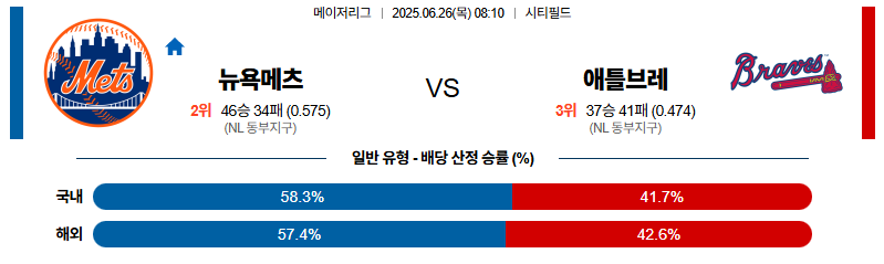 뉴욕메츠 대 애틀랜타 MLB 06월26일 맞대결 생중계, 스포츠중계, 스포츠분석