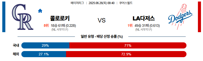 콜로라도 대 LA다저스 MLB 06월26일 맞대결 생중계, 스포츠중계, 스포츠분석