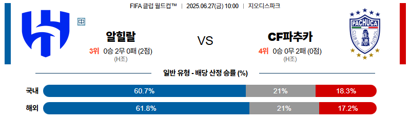 알 힐랄은 공격과 수비 모든 구간에서 완성도를 끌어올린 팀이며, 파추카는 수비 전환 시 노출되는 구조적 불안으로 인해 실점 리스크가 존재합니다. 이 경기는 전체적인 조직력과 경기 주도권에서 앞선 알 힐랄이 지배할 수밖에 없는 흐름입니다.