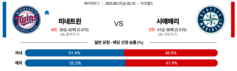 미네소타 대 시애틀 MLB 06월27일 맞대결 생중계, 스포츠중계, 스포츠분석