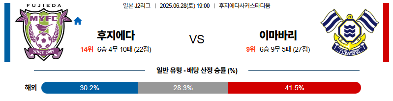 후지에다 대 이마바리 J리그2 06월28일 맞대결 생중계, 스포츠중계, 스포츠분석