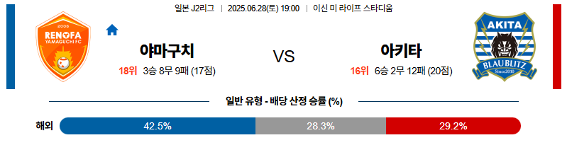 야마구치 대 아키타 J리그2 06월28일 맞대결 생중계, 스포츠중계, 스포츠분석