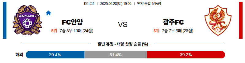 광주 FC가 전술적으로 우위를 점하고 있으며, 안양 FC의 수비 집중력과 후반 체력 저하가 경기에 영향을 미칠 것으로 보입니다. 따라서 광주 FC의 승리를 예상합니다.