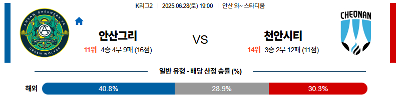 안산 대 천안 K리그2 06월28일 맞대결 생중계, 스포츠중계, 스포츠분석