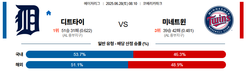 디트로이트 대 미네소타 MLB 06월28일 맞대결 생중계, 스포츠중계, 스포츠분석