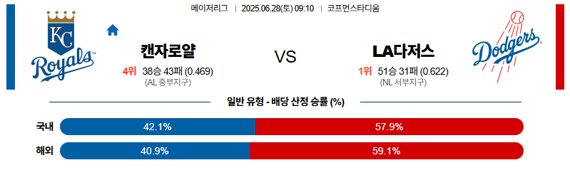 캔자스시티 대 LA다저스 MLB 06월28일 맞대결 생중계, 스포츠중계, 스포츠분석