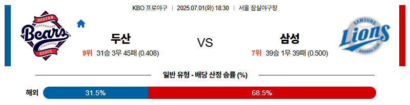두산 대 삼성 KBO 07월01일 맞대결 생중계, 스포츠중계, 스포츠분석