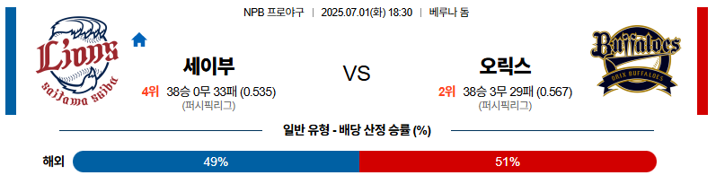 세이부 대 오릭스 NPB 07월01일 맞대결 생중계, 스포츠중계, 스포츠분석