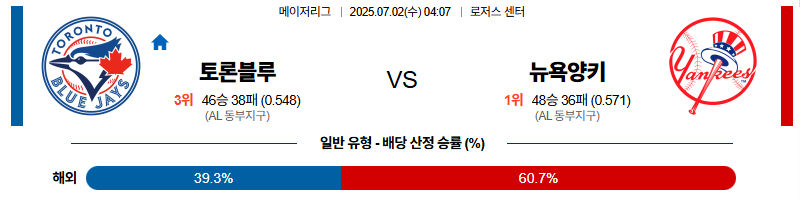 토론토 대 뉴욕양키즈 MLB 07월02일 맞대결 생중계, 스포츠중계, 스포츠분석