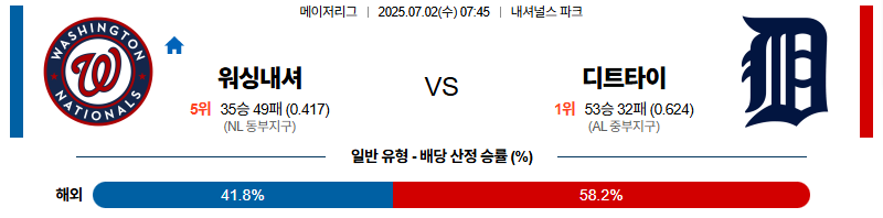 워싱턴 대 디트로이트 MLB 07월02일 맞대결 생중계, 스포츠중계, 스포츠분석