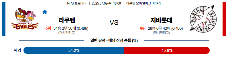 라쿠텐 대 지바롯데 NPB 07월02일 맞대결 생중계, 스포츠중계, 스포츠분석