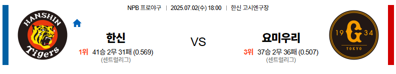 한신 대 요미우리 NPB 07월02일 맞대결 생중계, 스포츠중계, 스포츠분석