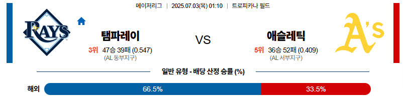 탬파베이 대 애슬레틱스 MLB 07월03일 맞대결 생중계, 스포츠중계, 스포츠분석