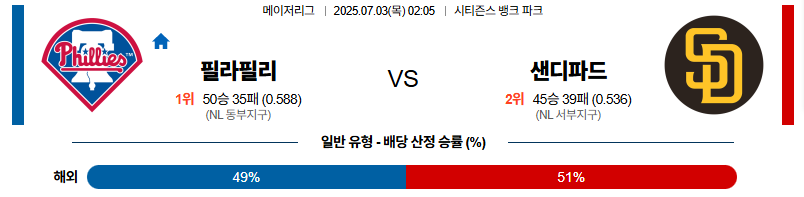 필라델피아 대 샌디에이고 MLB 07월03일 맞대결 생중계, 스포츠중계, 스포츠분석