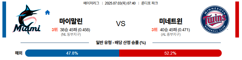 마이애미 대 미네소타 MLB 07월03일 맞대결 생중계, 스포츠중계, 스포츠분석