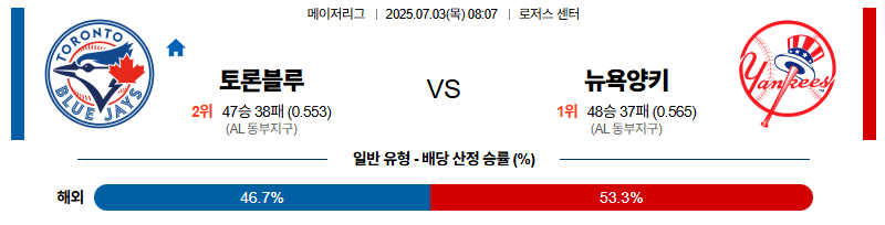 토론토 대 뉴욕양키스 MLB 07월03일 맞대결 생중계, 스포츠중계, 스포츠분석