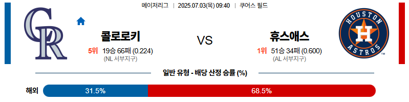 콜로라도 대 휴스턴 MLB 07월03일 맞대결 생중계, 스포츠중계, 스포츠분석