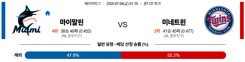 마이애미 대 미네소타 MLB 07월04일 맞대결 생중계, 스포츠중계, 스포츠분석