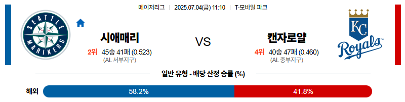 시애틀 대 캔자스시티 MLB 07월04일 맞대결 생중계, 스포츠중계, 스포츠분석