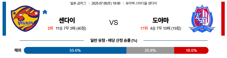 센다이는 빠른 템포와 안정적인 조직력을 기반으로 경기를 지배하며, 홈에서의 경기력 상승 흐름도 확연합니다. 반면 도야마는 수비 간격 유지와 중원 탈압박 모두에서 허점을 드러내고 있으며, 공격 전개도 제한적입니다. 전체적인 흐름에서 센다이의 전술 구조는 상대보다 한 수 위이며, 이번 경기는 센다이 쪽에 확실히 기운 승부로 예상됩니다. 실점 리스크가 적고 전방 화력까지 동반된 안정된 경기 흐름이 기대됩니다.