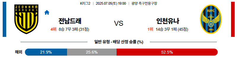 전남 대 인천 K리그2 07월05일 맞대결 생중계, 스포츠중계, 스포츠분석