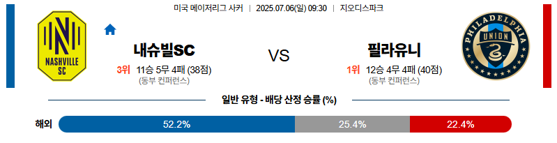 내슈빌은 중앙 수비 스피드 저하와 뒷공간 커버 실패가 반복되며, 상대의 빠른 공격에 대응하기 어려운 팀입니다. 필라델피아는 침투 속도와 전진 템포에서 더 명확한 강점을 지닌 만큼, 내슈빌 수비 라인을 공략할 준비가 되어 있습니다. 전술적 상성과 흐름의 전개 방향 모두 필라델피아 쪽으로 기울고 있는 경기입니다. 이번 매치는 흐름을 먼저 잡는 쪽이 경기를 지배하게 될 것이며, 그 팀은 필라델피아가 될 가능성이 높습니다.