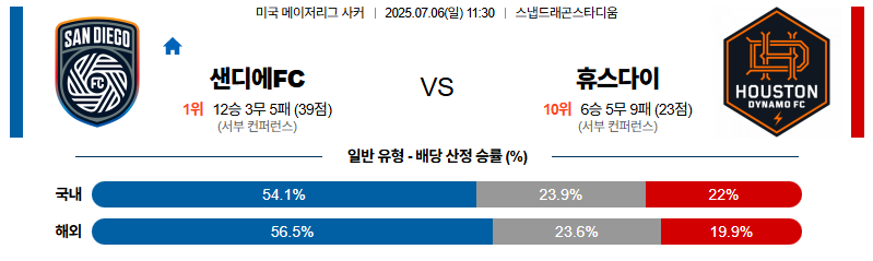 샌디에고 대 휴스턴 메이저리그사커 07월06일 맞대결 생중계, 스포츠중계, 스포츠분석
