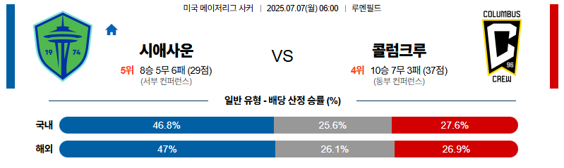 시애틀 대 콜럼버스 메이저리그사커 07월07일 맞대결 생중계, 스포츠중계, 스포츠분석