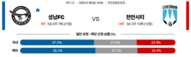 성남 대 천안 K리그2 07월06일 맞대결 생중계, 스포츠중계, 스포츠분석