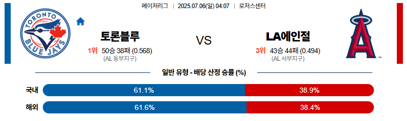 토론토 대 LA에인절스 MLB 07월06일 맞대결 생중계, 스포츠중계, 스포츠분석