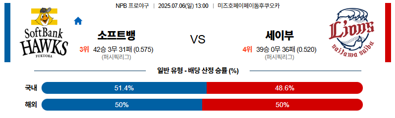 소프트뱅크 대 세이부 NPB 07월06일 맞대결 생중계, 스포츠중계, 스포츠분석