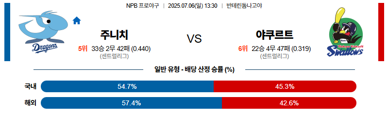 주니치 대 야쿠르트 NPB 07월06일 맞대결 생중계, 스포츠중계, 스포츠분석