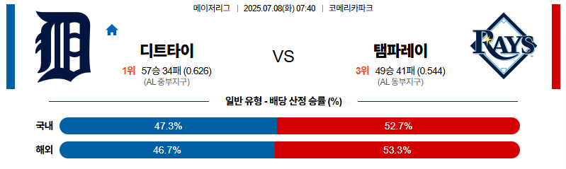 디트로이트 대 탬파베이 MLB 07월08일 맞대결 생중계, 스포츠중계, 스포츠분석