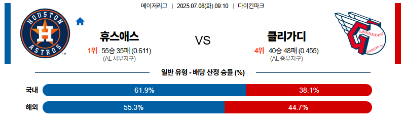 휴스턴 대 클리블랜드 MLB 07월08일 맞대결 생중계, 스포츠중계, 스포츠분석