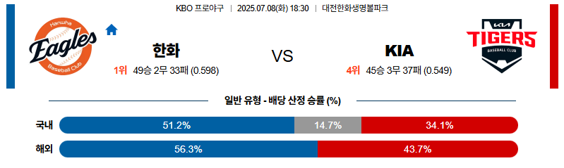 예상 스코어는 5:3으로 한화의 승리를 추천드립니다. 승패는 한화 승리, 핸디는 KIA 승리, 언더 오버는 언더로 설정하겠습니다. 5이닝 승패는 한화 승리로 예상합니다.