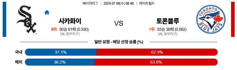 시카고W 대 토론토 MLB 07월09일 맞대결 생중계, 스포츠중계, 스포츠분석