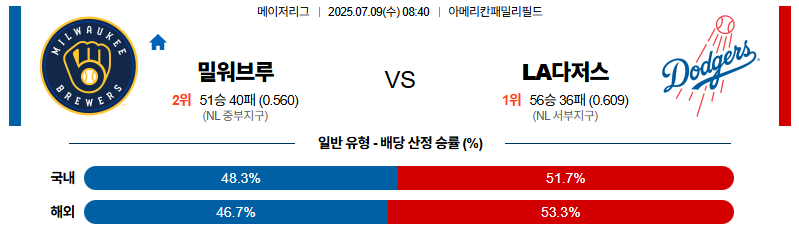 밀워키 대 LA다저스 MLB 07월09일 맞대결 생중계, 스포츠중계, 스포츠분석