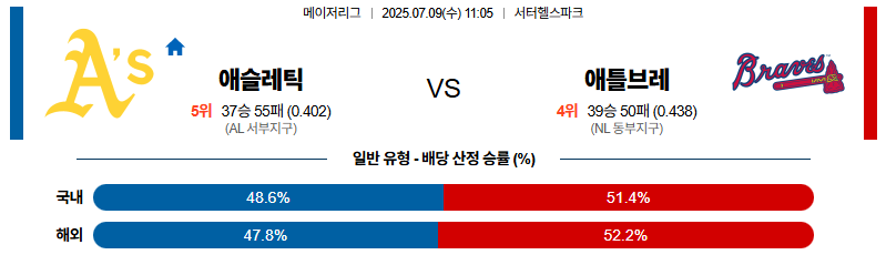 애슬레틱스 대 애틀랜타 MLB 07월09일 맞대결 생중계, 스포츠중계, 스포츠분석