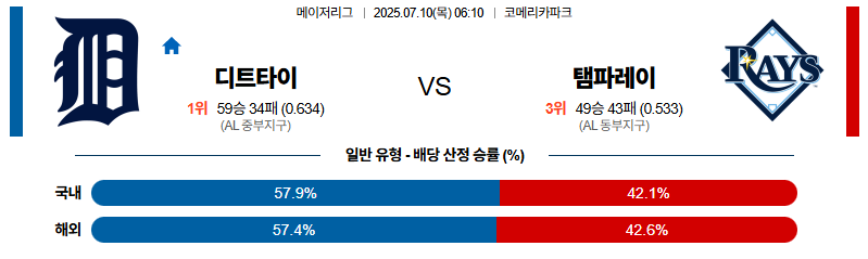 디트로이트 대 탬파베이 MLB 07월10일 맞대결 생중계, 스포츠중계, 스포츠분석