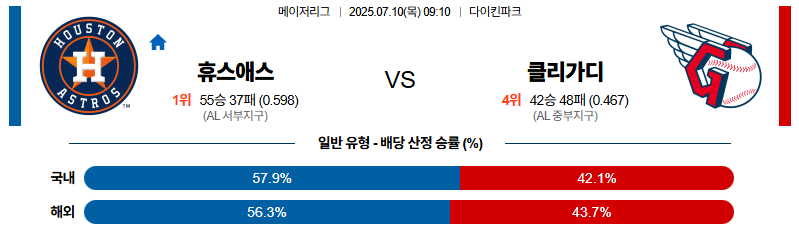휴스턴 대 클리블랜드 MLB 07월10일 맞대결 생중계, 스포츠중계, 스포츠분석