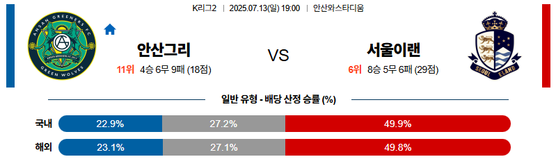 안산 대 서울이랜드 K리그2 07월13일 맞대결 생중계, 스포츠중계, 스포츠분석