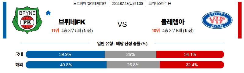 브뤼네 대 볼레렝가 노르웨이1부 07월13일 맞대결 생중계, 스포츠중계, 스포츠분석