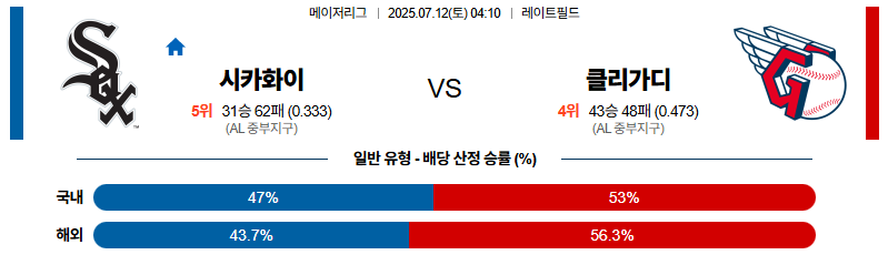 시카고W 대 클리블랜드 MLB 07월12일 맞대결 생중계, 스포츠중계, 스포츠분석